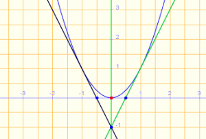 Notar como se verifica gráficamente lo comentado: Creciente en x = 1, decreciente en x = – 1, ni creciente ni decreciente en x=0 (mínimo)