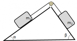 Disponemos de dos cuerpos apoyados sobre dos planos inclinados, de α=30º y β=60º, con rozamiento (μ = 0,05) tal y como se muestra en el esquema adjunto, de masas m1 y m2, de 5 kg y 4 kg respectivamente. Los cuerpos están unidos por una cuerda de masa despreciable e inextensible, que pasa por la garganta de una polea de masa despreciable y sin rozamiento.