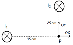 Por el cable 1 circula una corriente de I1=4 A, en el sentido indicado (perpendicular al plano del papel y hacia dentro, según la simbología habitual); por el cable 2 una corriente de I2=9,5 A, en el sentido indicado (perpendicular al plano del papel y hacia afuera). Las distancias de cada cable de corriente al punto P están indicadas en el dibujo (35 cm del cable 1 a P y 25 cm del cable 2 a P). Suponiendo que los cables son rectilíneos e indefinidos, responder a las siguientes preguntas: