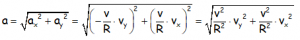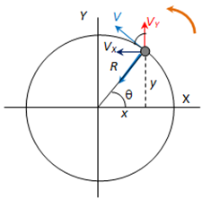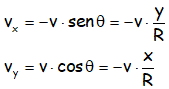 La velocidad, que es tangente a la trayectoria es constante y la podemos descomponer en los ejes habituales, en una Vx y una Vy, según el dibujo.