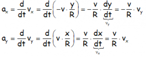 Teniendo además en cuenta que la aceleración es igual a la derivada de la velocidad con respecto al tiempo (la aceleración es la variación de la velocidad), nos queda para cada una de las componentes de la aceleración: